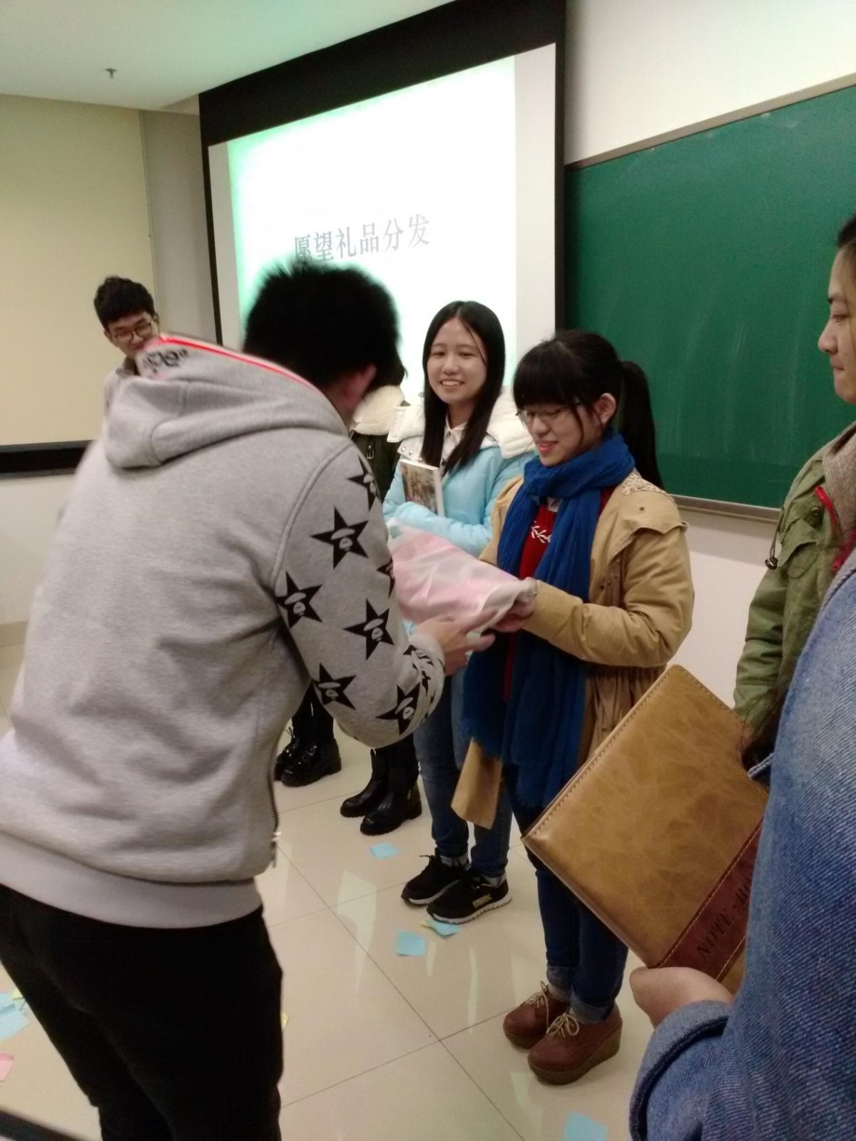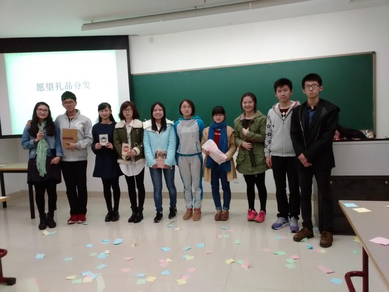 主持人首先致开场白,很快将现场的气氛活跃开来,桌上摆满了小零食,无不流出温馨气息。交流会主要以几个小游戏来增进大家的交流,分别有手掌写字、甩便利贴大赛、嘴咬笔写字。每一个小游戏都由同学之间合作完成,游戏中不时有欢声笑语声传出,这也很快打破大家的陌生感。在精彩的游戏过后,支持人宣布即将实现大家的愿望。由主席牟佳妮和副主席张权给各位许愿者送上该部门为其实现的愿望礼品,获得愿望礼物的同学表示了实现愿望的喜悦和对心理素质拓展中心成员的感谢。最后在收获满满的掌声中部长陈连对本次活动进行总结,大家合影留恋。