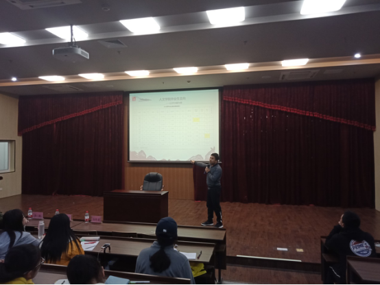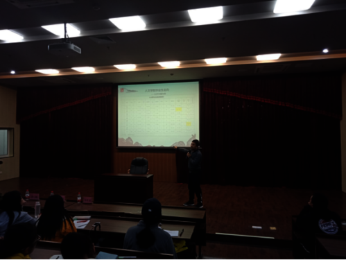 中文172班的陈渊同学介绍职业规划大赛。陈渊同学就“比赛流程”和“比赛收获”两方面进行了详细且耐心的讲解,让同学们充分了解了职业生涯规划大赛的组织形式与意义,大大激发了同学们的参赛热情。