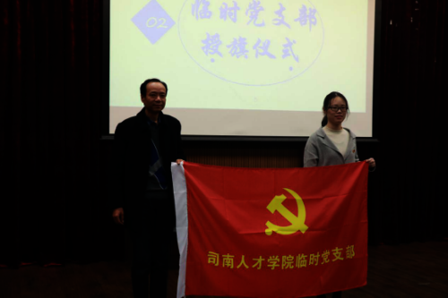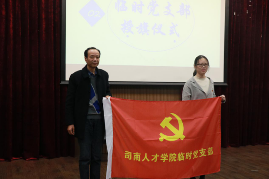 全体学员起立奏唱国歌后,现场举行了临时党支部授旗仪式,由吴兴农书记向临时党支部书记高露薇授旗,旗帜的传递意味着学院党委在培养学生干部上的重任的传递。随后,吴书记和管书记为上台的学员代表佩戴司南徽章。