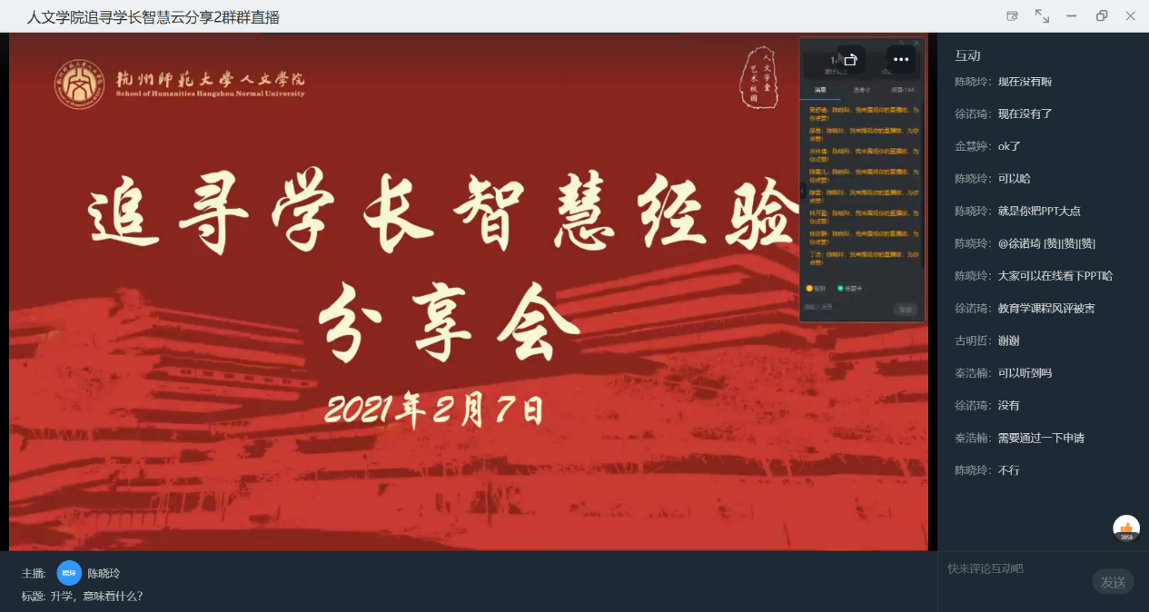 2021年2月7日14:00,小说狂人 于钉钉平台顺利举办追寻学长智慧之经验分享会系列讲座——“升学,意味着什么?”。讲座由由小说狂人 学工办主任陈晓玲主持。本次讲座共有270人参加,点赞数高达3960次。