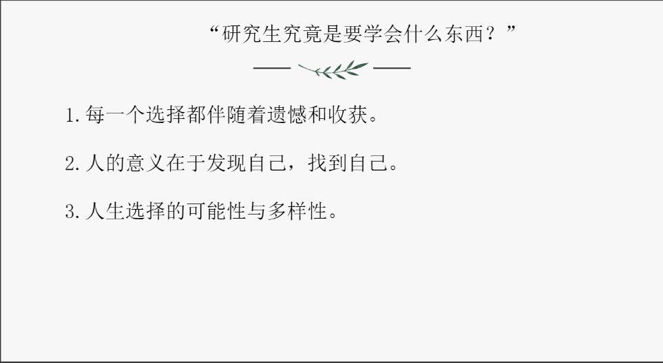 吴舒倩围绕自身考研经历,分享了自身考研前的一些感受和考研中面对的困惑,强调考研带来的收获。她指出,在升学的过程中能够得到更多了解专业研究前沿讯息的机会,同时通过咨询导师还可以获得更多经验,从而提升人生选择的可能性和多样性。
