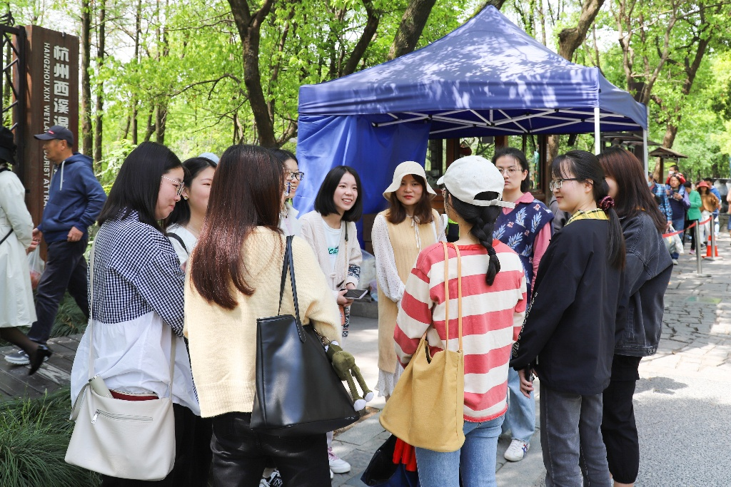 四月春日融融,万物蓬勃,柳绿花红,西溪国家湿地公园一派生机繁荣景象。大家一路兴致高昂,谈笑风生。工作人员在各路线上设置了多个打卡点,参与同学成群结伴地积极投入到互动小游戏中。在需要团队合作精神的项目里,同学们团结协作,互帮互助,共同完成打卡任务;在竞赛比拼环节,每个人都专注投入,和谐切磋,迎来了一阵又一阵的欢声笑语。