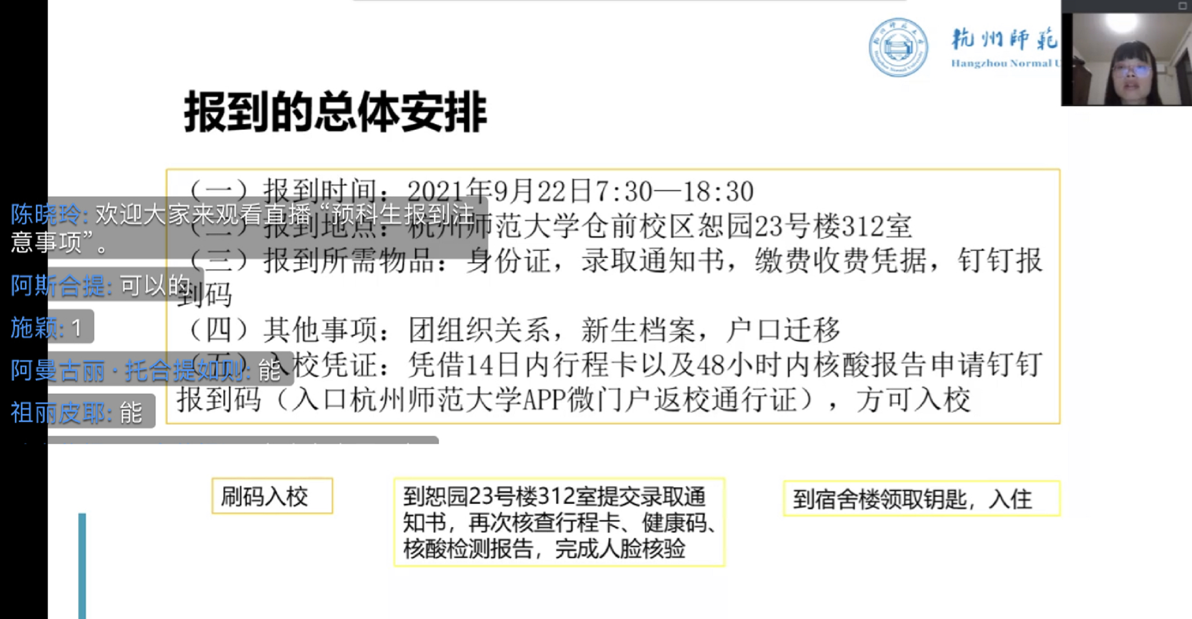 会议伊始,陈晓玲老师向全体即将入学的预科生表示热烈的欢迎,对大家的到来充满期待。随后,陈晓玲老师向大家详细介绍入学流程,为大家两天后的开学做好准备。会议内容主要分为四部分,报到前的准备、班级情况介绍、报到当天注意事项、其他事宜。首先,陈晓玲老师强调了正常报到的前提条件,特别提醒大家来校途中做好防疫准备、全程佩戴口罩,尤其注意是否经过福建等疫情较重的地区,并向大家演示如何申请报到码。其次,陈晓玲老师详细讲解了9月22日报到流程和总体安排,通过学校地图细心告知大家找到接站班车及最近的入校路线,并提醒携带报到所需资料。接着,陈晓玲老师又为大家介绍了预科211班的总体情况,班级由班主任王咏老师,辅导员陈晓玲老师,班级助理孙贺晟、施颖和40名预科生组成,其中女生29名,男生11名。另外,陈晓玲老师又强调了入学后的防疫重要性、预防诈骗的警惕性以及坚持努力学习的必要性,寄语大家在新的阶段不断前行。