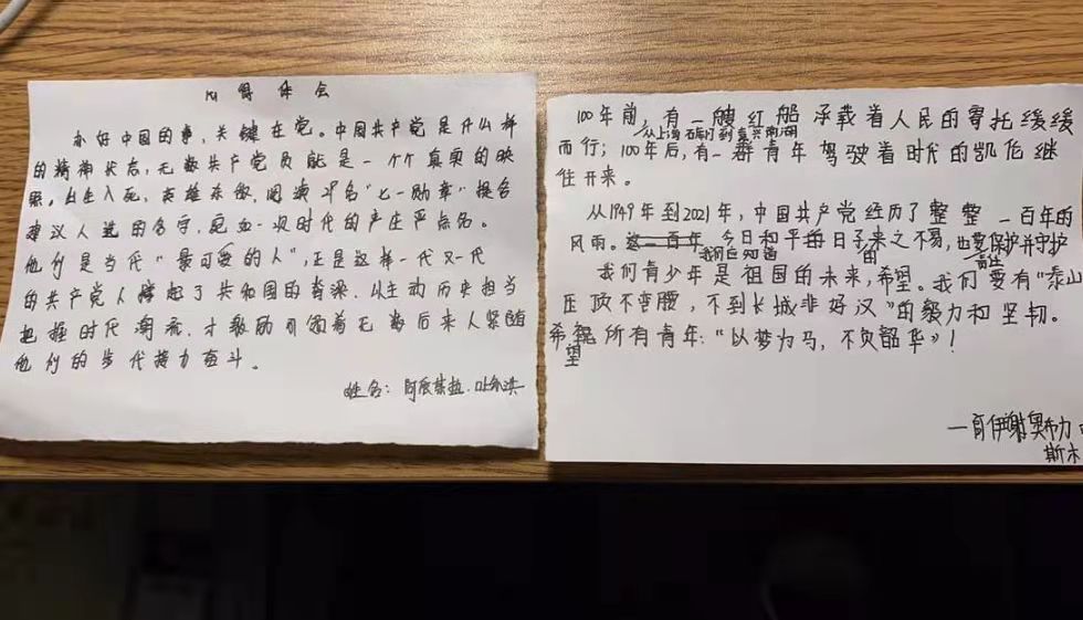 活动开始,哈力扎提、叶斯力、古丽菲亚和迪力胡马尔同学上台宣读习近平总书记在庆祝中国共产党成立100周年“七一勋章”颁授仪式上重要讲话。宣读后,同学们踊跃地发表自己的意见,米叶尔同学表达了自己对“七一勋章”的认识,她说:“中国共产党成立100年以来,走过坎坎坷坷,一次次战胜困境,从开始的十几人到现在的几千万人,‘七一勋章’是各条战线中党员杰出贡献的代表。党员对他们而言不仅是一个身份,更是一种责任,他们信念坚定,不忘初心,不移其志,以坚韧执着的理想信念,带领全国各族人民走向幸福。”米克热班同学表示:“没有共产党,就没有新中国,我们美好的生活来之不易。是中国共产党带领全国人民走向了幸福生活!”在被问到青少年应该怎么做时,米叶尔同学表示:“我们要吸取长辈们的经验,将来无论入党与否,都要以党员标准来严格要求自己,把国家与人民的利益放在第一位,为人民服务。”