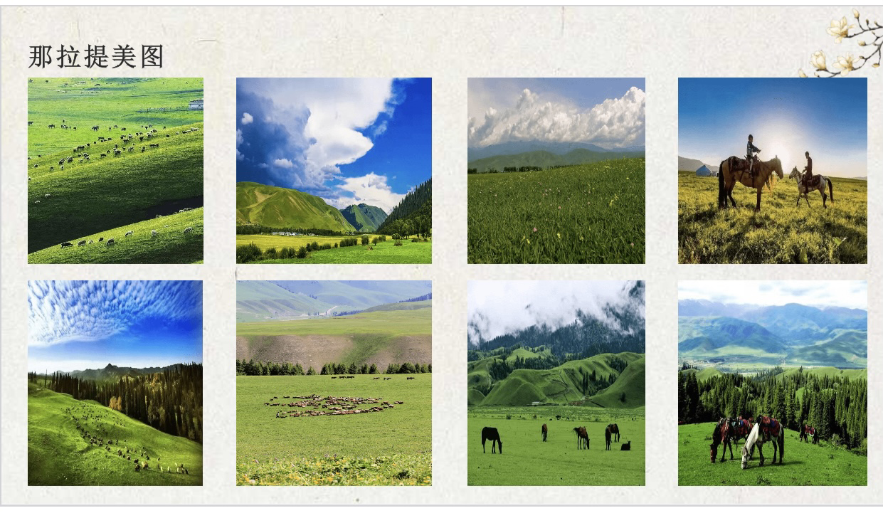 最后叶斯力同学介绍了自己的家乡伊犁哈萨克自治州新源县,给大家看了一些家乡的城市照片和景区美景图,着重提到了家乡的那拉提草原并分享一些美景希望大家去旅游。