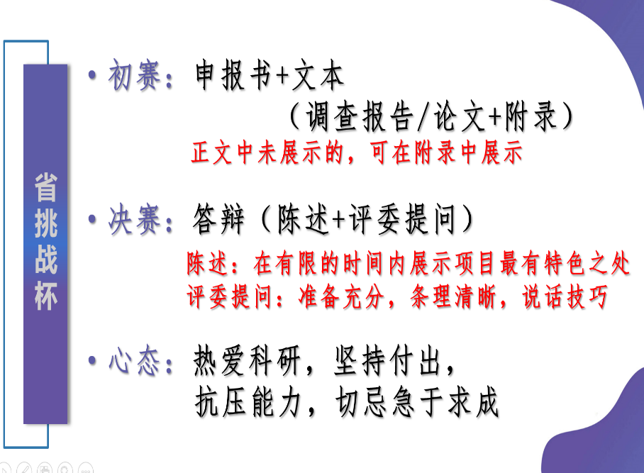 宣讲会上,吴心如学姐主要从选题方向、团队组成、理论依据、问卷设计、访谈技巧暑期实践、滚动科研以及省挑战杯八个方面对科创竞赛进行了介绍。