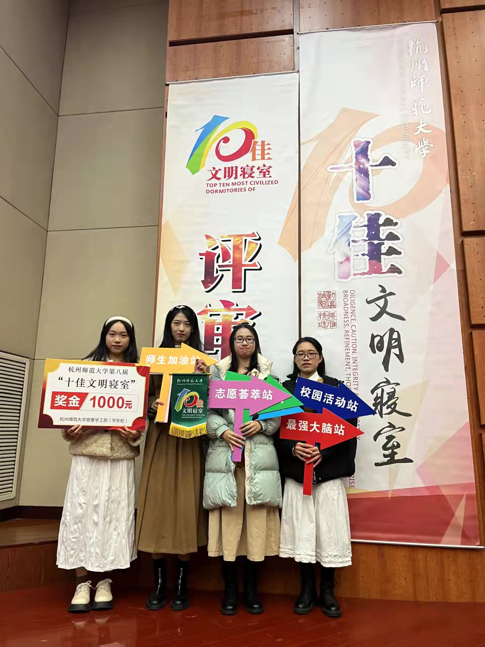 紧接着,我们来到了校园活动站。417寝室共参加校园文体活动14种,获浙江笔译大赛等比赛奖项16类,全员卡尔·马克思杯均分120分,跻身全校前200名。她们都是优异的个体,四人各自成长,勇攀高峰,在铸就更好的自己的同时也为共同的寝室带来荣光。