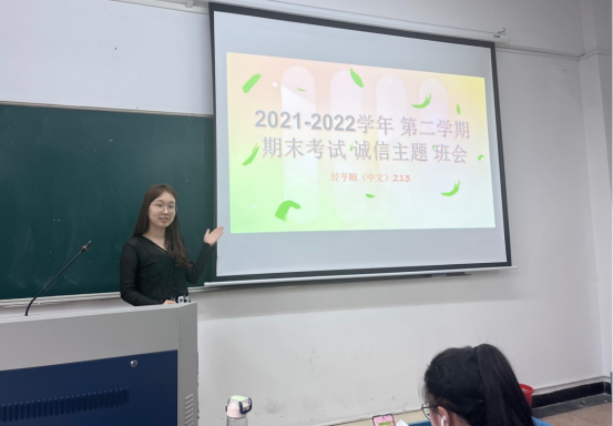 “诚信主题教育”班会强调立诚信为本的道德观念,营造积极向上的考试氛围,呼吁同学们诚信考试。经亨颐(中文)213班以“心中有敬畏,心间持诚信”为主题,强调了遵守考场规则的重要性。中文212班以“诚”+“信”=“诚信”的思考方式,带领同学进一步思考为何“诚信”,强调诚信对于人生意义。历史213班深入挖掘造成考试诚信失守的原因,和同学们分享了缓解考前焦虑的有效方法,为同学们平稳地度过考试周保驾护航。