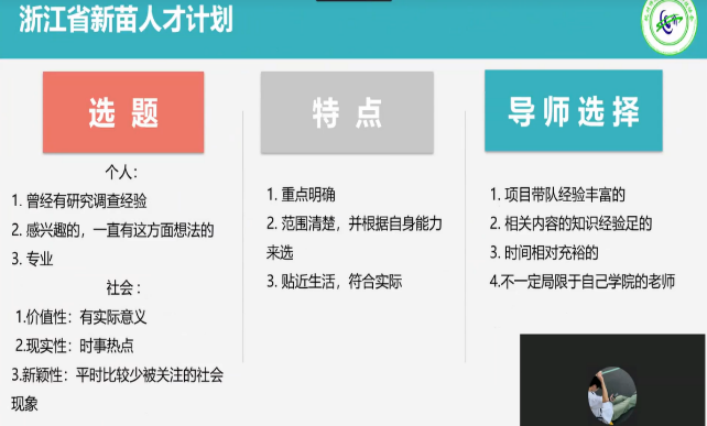 宣讲会上,两位学长详细为大家介绍了星光计划、浙江省新苗人才计划、挑战杯以及“本创”和“国创”。他们从参赛对象、时间轴、奖励机制、结题要求等方面具体介绍了星光计划项目,为同学们描绘了参加星光计划的初步图景,并且以金字塔的形式生动地展现了参加科研竞赛的优点与收获。不仅如此,两位学长还详细讲述了学校对科创竞赛的支持与奖励,有针对性地提出了适合小说狂人 同学参加的各大竞赛项目。经过介绍,同学们对于参赛技巧和竞赛规则等方面有了清晰的认识和明确的方向,其展示的历年学长学姐的优秀战绩和学校对科创的支持力度,也增强了同学们的信心和动力。