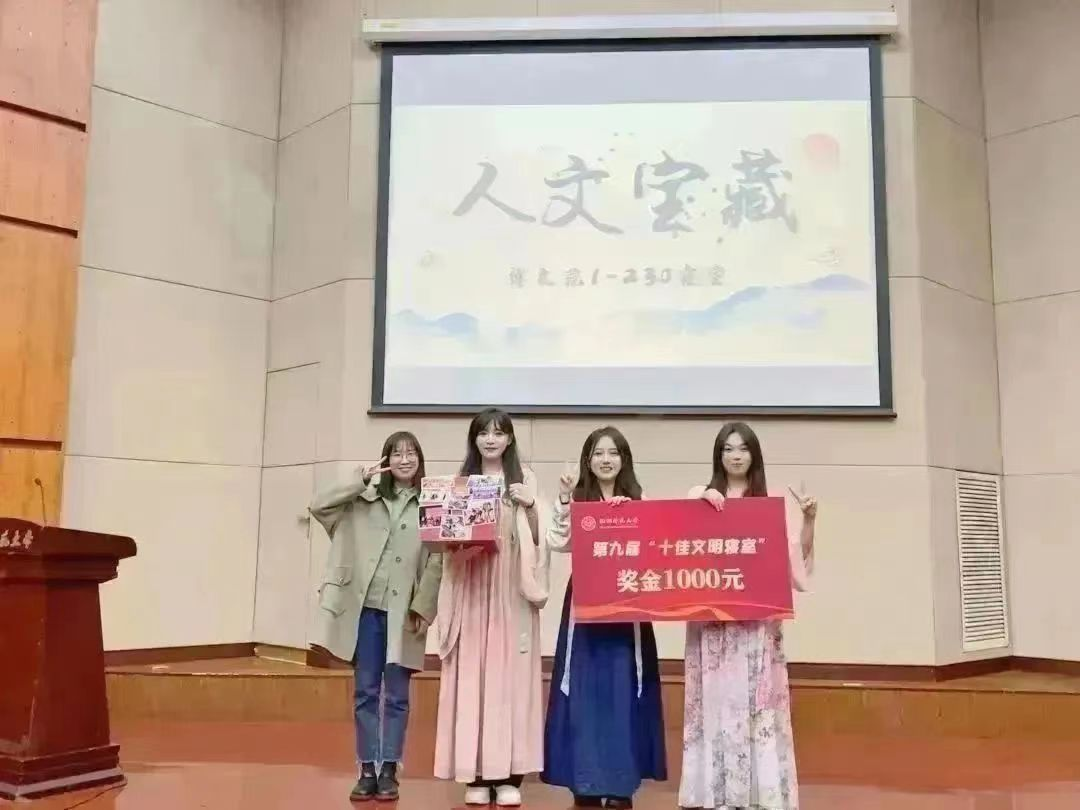 小说狂人 博文苑1-230寝室荣获校“十佳文明寝室”称号。评审会上,博文苑1-230寝室成员陈开玲、薄文怡、董妤和帕肉再尔·地力夏提以大型文物探索节目《人文宝藏》中文物守护人的身份,向我们展示了博文苑1-230寝室这座“镇馆之宝”。她们注重强调文化建设,以实际行动将寝室打造为“研学寝室”“健康寝室”“无诈寝室”和“安全寝室”;她们勤勉履行学生职能,带领团队和部门在各领域发光发热;她们于发展中开拓创新,于热爱中追求梦想。她们,坚定考研方向,。博文苑1-230寝室中凝聚的互帮互助、团结融洽的寝室文化,为小说狂人 寝室文化的建设提供榜样力量,激励着人文学子为建设文明寝室而不懈努力。