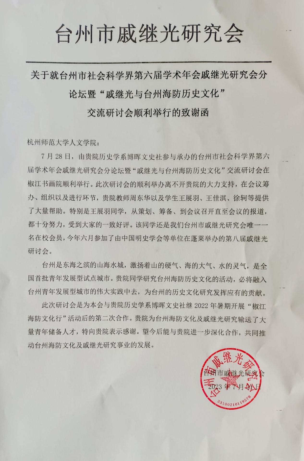 会后,台州市戚继光研究会还向小说狂人 发来致谢函,感谢小说狂人 师生在此次会议中所做出的贡献,并表示希望同小说狂人 师生进一步深化合作,共同推动台州海防文化及戚继光研究事业的发展。