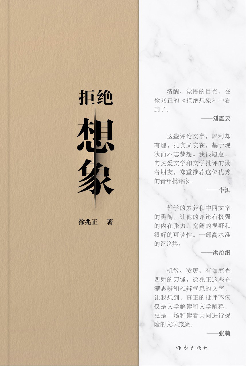 【成果介绍】《拒绝想象》是青年批评家徐兆正首部批评文集,作者以其宽阔的视野、透彻的思辨和犀利的文字,对中国文学进行了多面向的有力思考。全书分为上下两编,上编主要以体裁划分。在上编中,无论是先锋写作(《现实主义语境中的先锋写作可能》)、历史小说(《历史小说的共情与想象》)还是侦探推理小说(《当代叙事与侦探小说的结构》)等各个领域,徐兆正的分析和思辨都切中肯綮,卓有见地。下编以作家论为主,写作对象包括林语堂(《林语堂的三重身份》)、刘震云(《刘震云创作脉络辨》)、阿乙(《阿乙论》)等,将名家形象以严谨的考据、精细的梳理立体化地用文字呈现了出来。