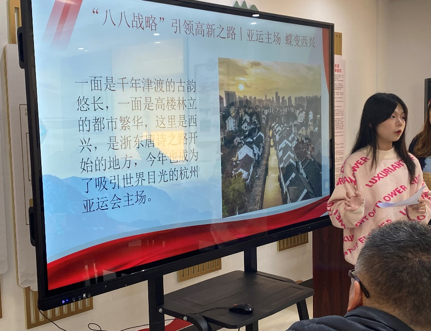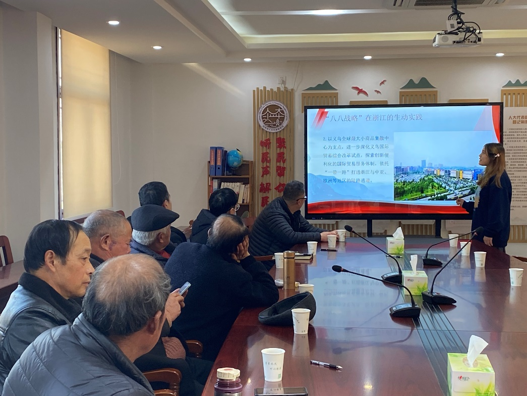 本次宣讲活动从“八八战略”和亚运会基本概况的介绍入手,引申到“八八战略”在亚运会的实践和“八八战略”未来发展企划。首先,宣讲者阿比代从 “八个优势”“八项举措”以及“浙江实践”两个方面系统全面地介绍了“八八战略”。从浙江海洋经济发展示范区和舟山群岛新区建设,到义乌成为全球最大小商品集散中心,再到阿里巴巴占领全球最大电子商务平台的宝座:浙江抓住发展机遇,把握自身优势,积极推进各项举措,助力长江经济带和一带一路的繁荣。在座的村民们都引以为豪,他们既因浙江人的身份感到自豪,又深觉八八战略大有裨益。接下来,阿比代简要介绍了杭州亚运会的盛况,曹颖则以“蝶变西兴”和“绿色办会”为主题讲述了八八战略在亚运盛会中的体现。无论是千年津渡与高楼林立的有机结合,还是清洁能源与节能建筑的共享出彩,她的宣讲无不体现了“杭州亚运会切实践行‘八八战略’,将理论与实践结合起来,向世界人民展示中华风采,展示浙江风采”的主题。最后,曹颖带领大家从改革、产业、城市三个维度一同展望“八八战略”,一起憧憬浙江的美好未来。