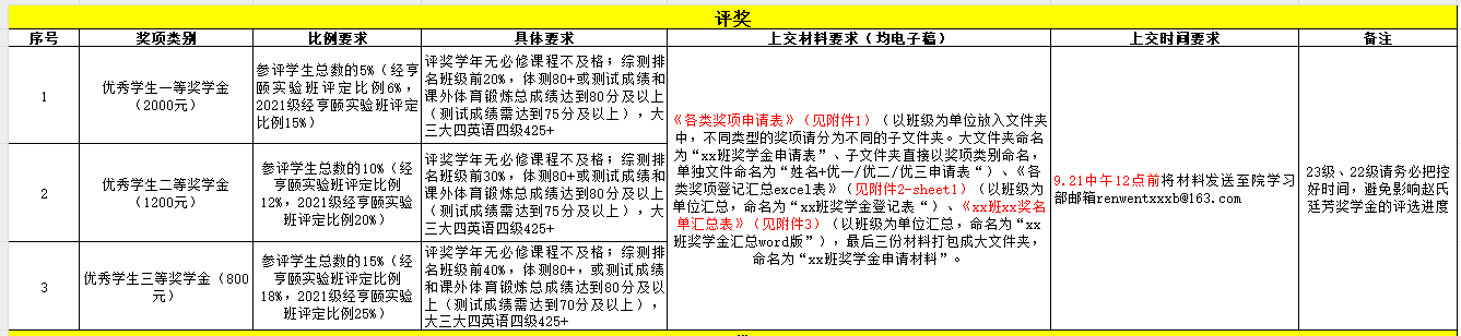 1.各班级要充分认识做好学生评奖评优工作的重要性,要严格按照“评选条件公开、评选名额公开、程序办法公开、评选结果公开”的原则做好各项评选工作,评选过程中要严格按照相关制度和规范流程执。