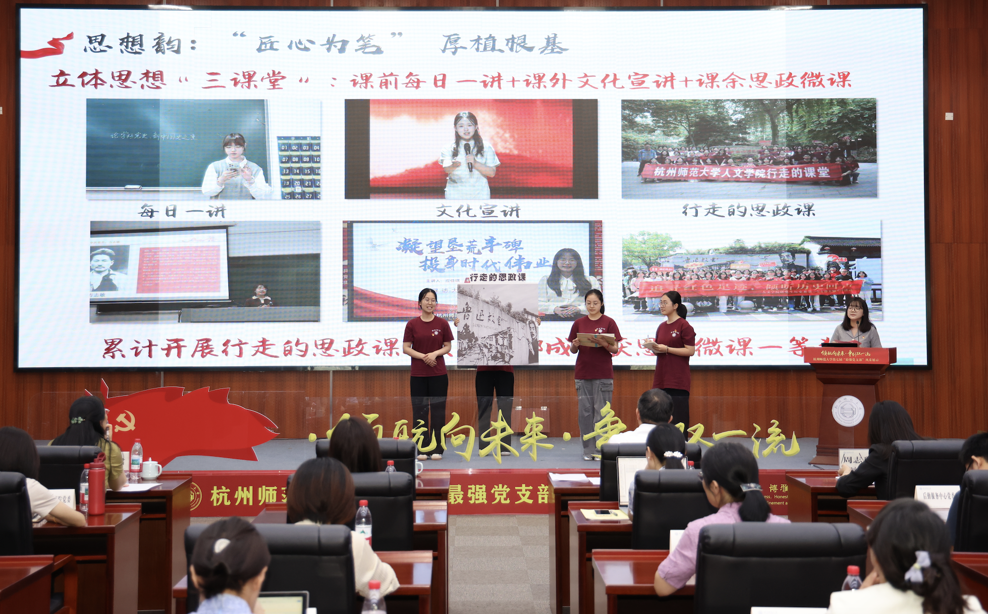 在现场风采展示环节中,支部书记和支部党员以讲故事的形式,通过执“思想之笔”、蘸“初心之墨”、铺“使命之纸”和研“创新之砚”四个部分,融合支部成员原创诗朗诵、特色行走思政课情景剧、特色三句半等丰富多彩的形式,展现了支部成员用专业所长,传播乡土故事、助力乡村振兴的事迹,充分展现了支部成员将青春写在祖国大地上的青年担当。