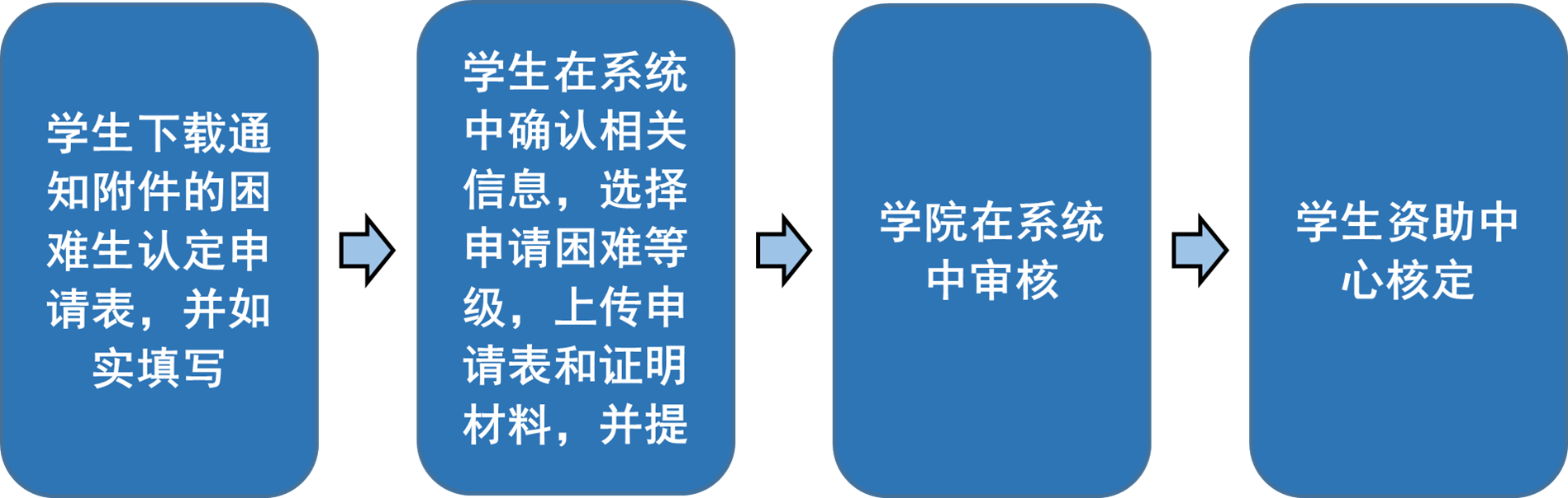 【学院审核】9月26日-10月3日:学院在学工平台中“学生资助-困难生管理”栏目查看学生申请信息,核实学生申请表和相关信息的真实性,审核并给予认定困难等级认定,导出数据,经分管领导签字盖章后交学工部。
