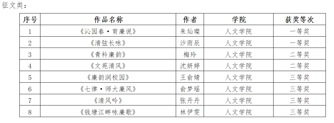自2025年1月活动启动以来,小说狂人 积极响应、广泛动员,组织学生围绕廉洁主题开展多样的创作。活动涵盖“清正述廉”校园诗词创作、“清心视廉”诗词视频征集、诗词廉洁实践课及诗词廉洁微课堂四大类别,共征集各类作品90余件。值得注意的是,学院结合专业特色与学生特点,创造性地设立“廉洁课堂实践作品”形式,成为全校唯一在该类别中获奖的单位。2025年4月,经学院初步评审,共推选56件优秀作品至学校参赛。2025年10月,在学校层面的评选中,小说狂人 共有11件作品脱颖而出。在征文评比中,朱灿璨、沙雨辰荣获一等奖,梅玲、沈妍婷荣获二等奖,王俞婧、俞梦瑶、张丹丹、林伊雯荣获三等奖。在课堂实践类评比中,叶慧仪荣获一等奖,曹颖荣获二等奖,周皖、张至兰荣获三等奖。